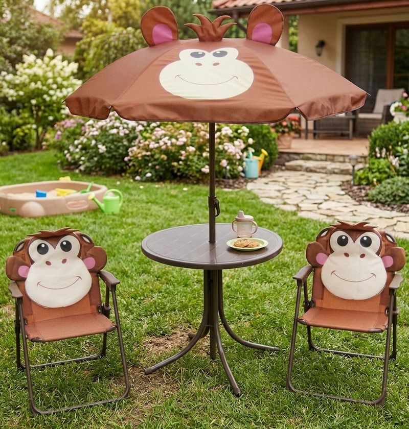 Set záhradný LEQ MELISENDA Mono, opica, slnečník 105 cm, stôl 50 cm, 2 stoličky. detský
