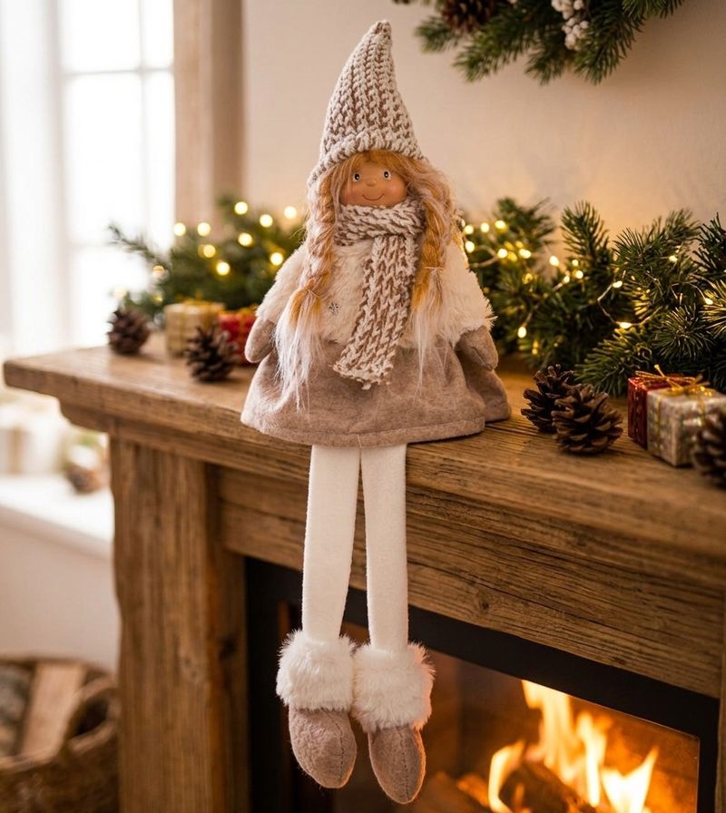 Postavička MagicHome Vianoce, Dievčatko s vysokým klobúkom, látkové, hnedo-biele, sediace, 17x12x54 cm