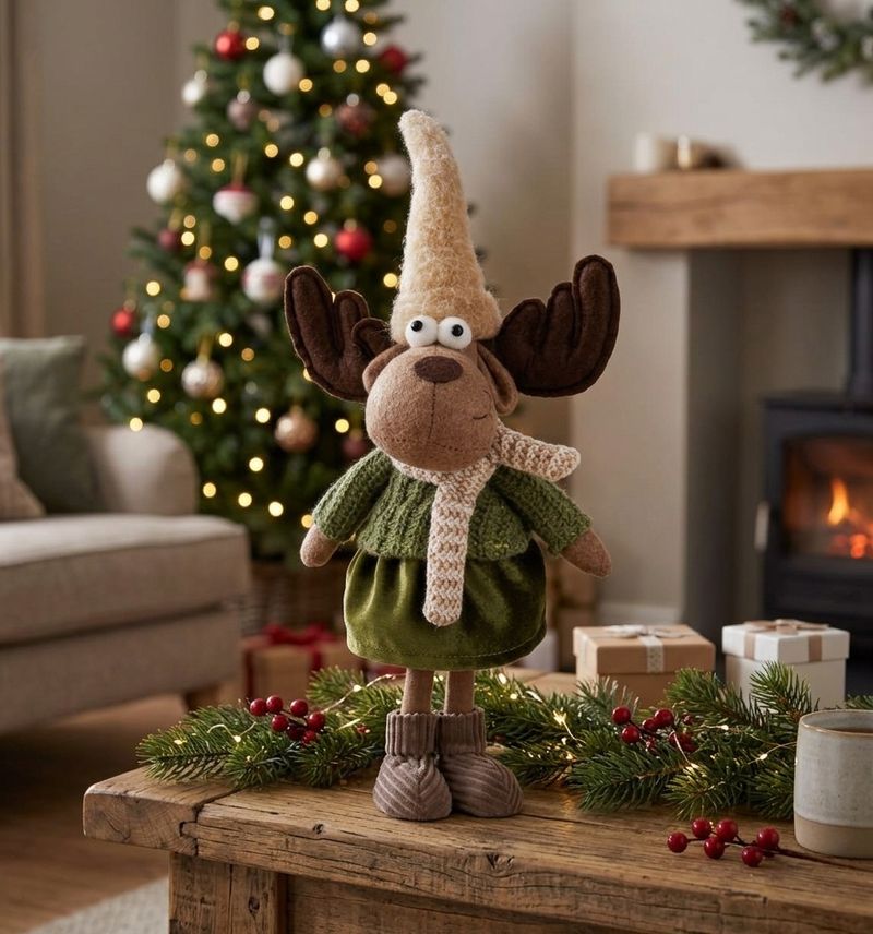 Sob je oblečený v zelenom svetríku, sukni a šále, doplnený výraznými parohmi a veselým výrazom. Jeho dizajn pôsobí hravo a štýlovo, čo ho robí ideálnym doplnkom do tradične i moderne ladených interiérov.
